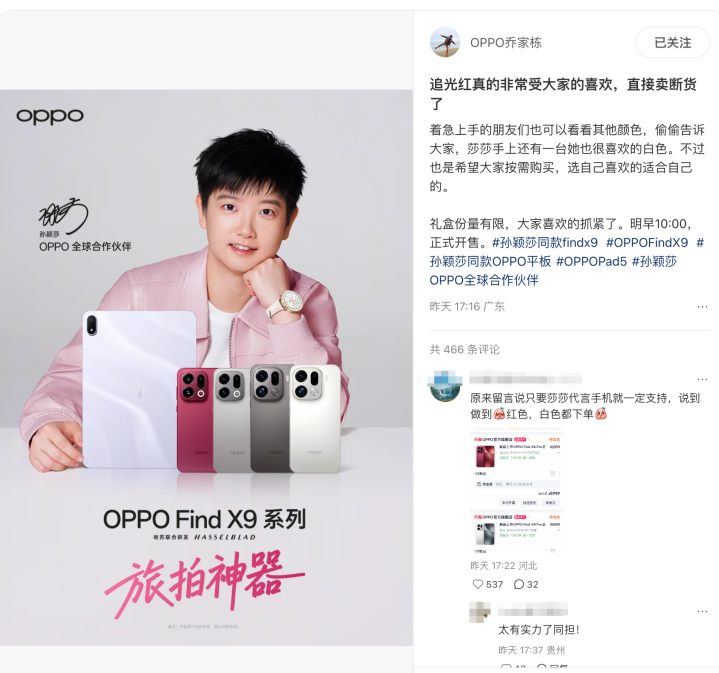 首销当日,甚至有其它品牌旗舰机用户换机的更多了,有用别的Ultra来换的,还有拿刚发布几天的Pro去换Find X9系列,导致首销即火爆,还出现部分版本缺货的情况。